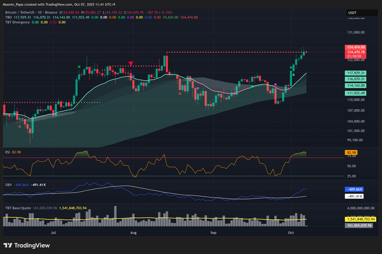 Bitcoin is trading around $124,000 after closing slightly above the TBO resistance at 124,474. On the daily chart, upper wicks indicate short-term selling pressure, though the TBO remains strongly bullish. Key indicators show a daily RSI peak of 84.79—nearing the 86.70 threshold required for further acceleration—alongside rising OBV and consistent volume outperformance above its moving average.