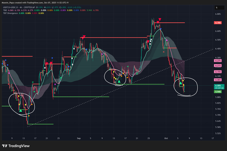 Stablecoin dominance has dropped to oversold territory and printed a daily TBO open-short signal. Historical TBO breakdowns accompanied by TBT bullish divergence on the 4-hour chart have preceded temporary reversals, suggesting a bounce could be imminent—though a decisive break below the 5.58% support level may signal a parabolic move toward a bull-market peak.