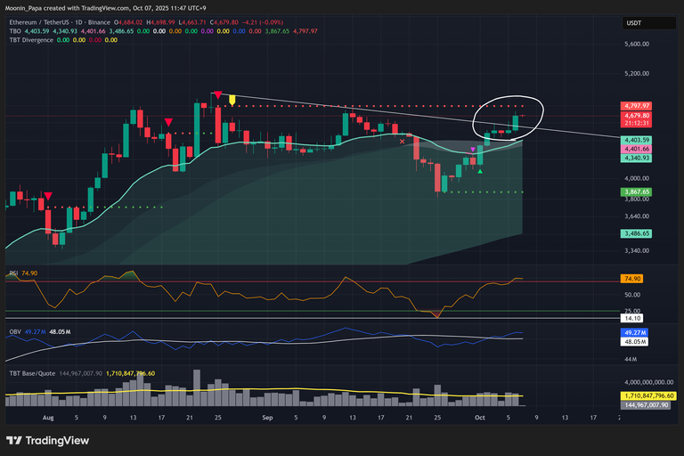 Ethereum has surpassed its overhead resistance, with daily RSI above 70, OBV holding above its moving average, and volume edging past its yellow MA since last Wednesday. However, the chart remains less robust than Bitcoin’s, and a recent 4-hour TBO breakout cluster may be more indicative of a topping formation than continued upside.