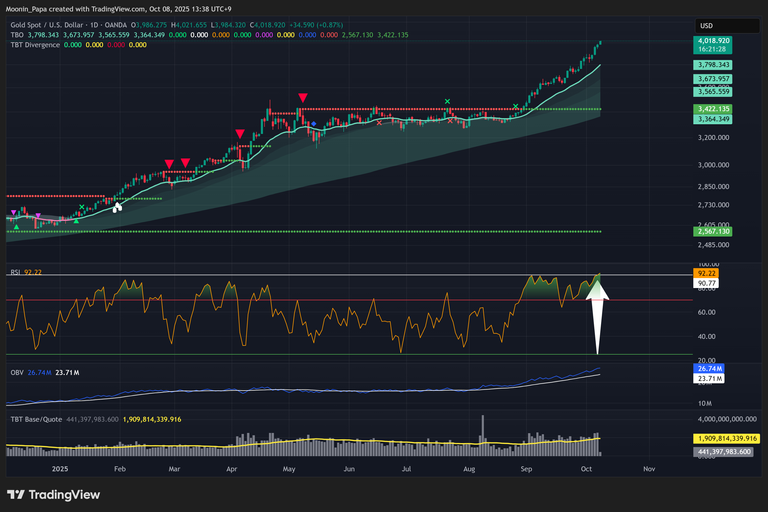 Gold surged through $4,000, with daily RSI marking a 90.8 high—an extreme parabolic move. Historically, parabolic advances in gold have led to steep corrections, and this outlier performance warns of potential systemic stress or “everything bubble” dynamics. Traders should be aware that while gold is often a safe-haven during turmoil, such euphoric price action can reverse rapidly.