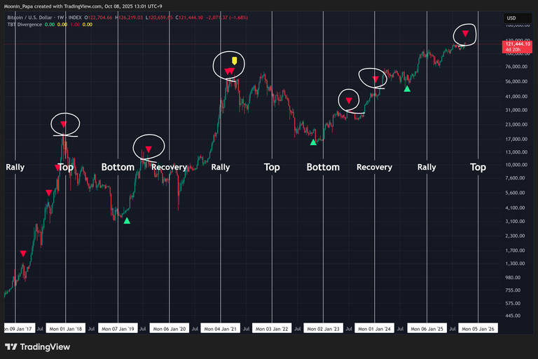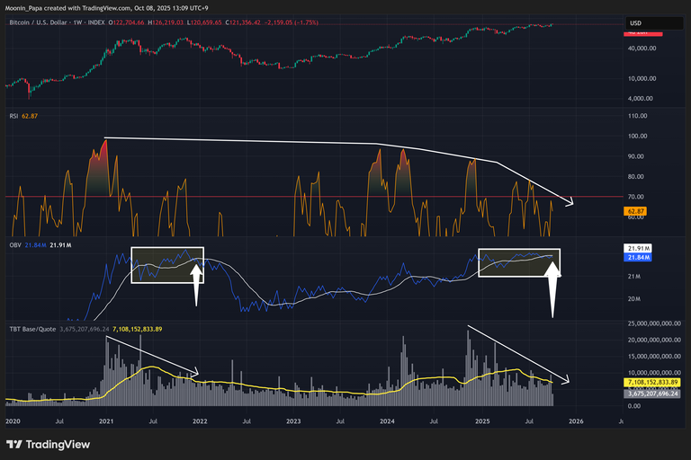 Daily on-balance volume (OBV) continues to exceed its moving average, reinforcing overall buying pressure, while daily volume surpassed the long-term moving average line. However, daily RSI carrying a lower high at 84.8 versus 86.7 in July signals bearish divergence against price. Weekly OBV has fallen below its MA, mirroring patterns seen in past summer corrections, and weekly volume has declined since last November. We have yet to see a TBO weekly Close Long (“Bear Formula”) at the Fast line near $112,000, but such a signal typically arrives late in a cycle.