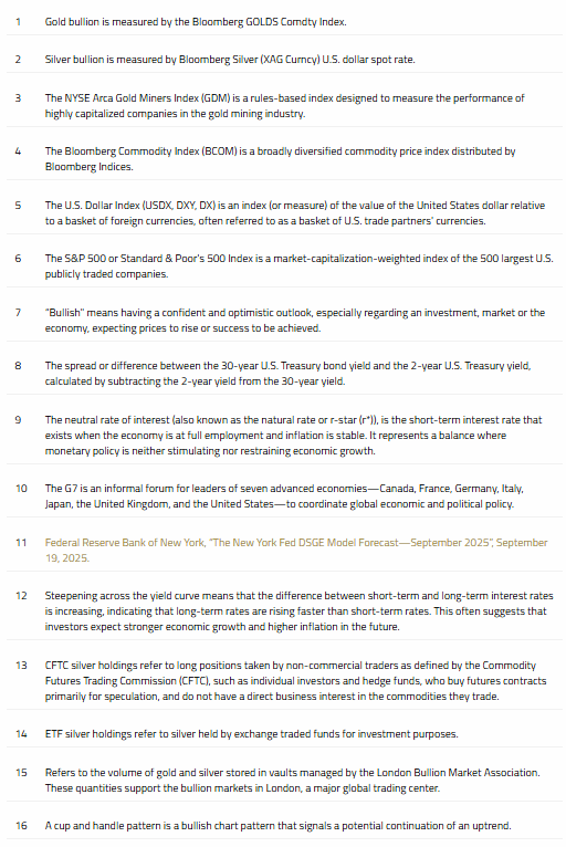 During September, gold rose about $210 per ounce between the start of the month and the September 17 meeting of the U.S. Federal Reserve’s Open Market Committee (FOMC). This rise was catalyzed mainly by long-end yields pricing an unsustainable monetary and fiscal path for the developed economies. Then, when the FOMC indicated it would cut rates three times in 2025, or likely 75 basis points by the time of the December FOMC meeting, gold rose another ~$200 per ounce into the month-end. Surprisingly weak employment data forced the Fed to focus on the labor market at the expense of inflation, thus prioritizing one side of its dual mandate. The market began to price in the likely effects of the federal funds rate falling to either the neutral rate9 or below—that is, higher growth and inflation in a “run-it-hot” monetary policy setup.