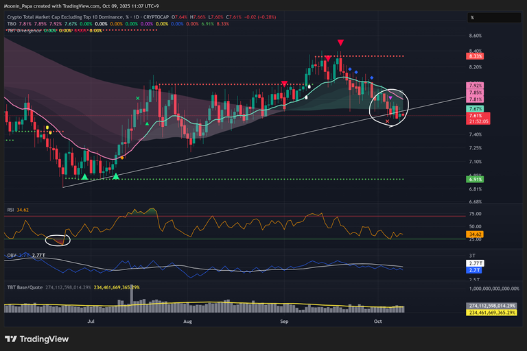 Ethereum sits above its daily TBO Cloud but exhibits weaker RSI, OBV and volume compared to Bitcoin. The 4-hour chart shows a third TBO Close Long in formation, which typically signals a lack of upward momentum. Absent a significant volume surge, ETH may retrace toward $4,000. The ETH/BTC pair also remains trapped in bearish consolidation within its daily TBO Cloud, with no reversal signals evident. Meanwhile, combined stablecoin dominance printed its second 4-hour TBO Close Short, a pattern that historically precedes a rise in dominance and a market-wide pullback.