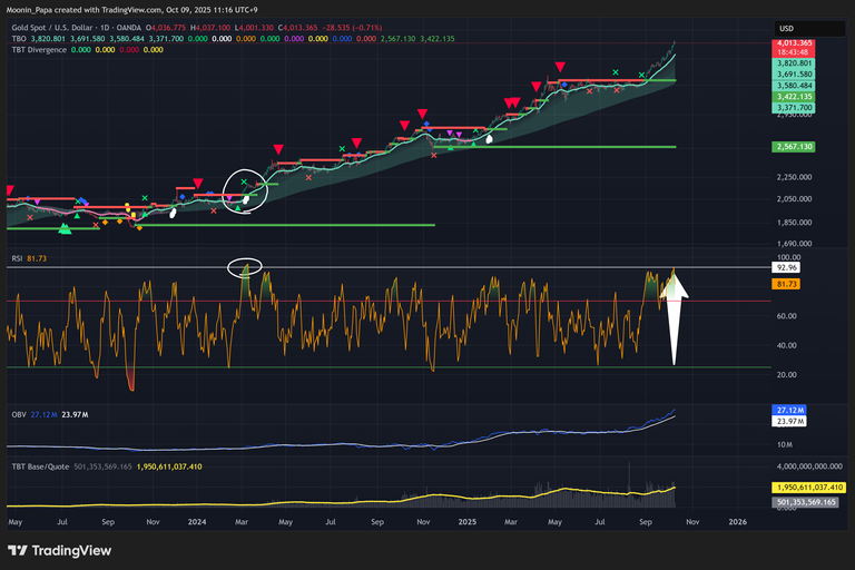 The US Dollar Index (DXY) printed a TBO Open Long above its 61.8% Fibonacci retracement, implying further dollar strength and pressure on EUR/USD and USD/JPY. Despite dollar gains, US equities (S&P 500, Dow Jones, Nasdaq) continue higher. Asian benchmarks show mixed signals: the Nikkei is advancing, Shanghai is struggling on declining volume and OBV, and the Hang Seng is rising but facing a weekly bearish divergence cluster. Precious metals are at extremes—Gold set a new all-time high above $4,000 with daily RSI near 93, while Silver approaches its record. The disconnect between bullish TradFi and muted crypto inflows warrants attention.
