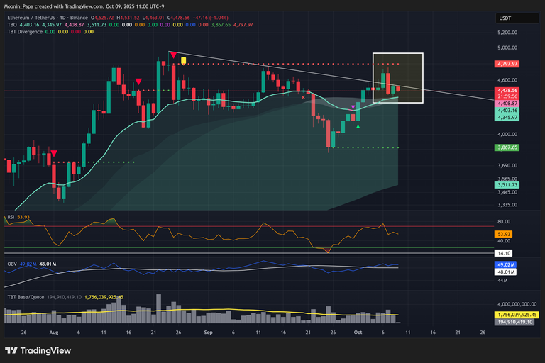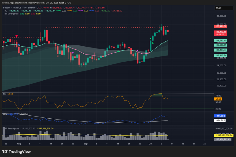 Bitcoin attempted a recovery but was unable to close above the historical TBO resistance at $124,000. Despite a lower-high on daily RSI below 70, bullish strength persists: price remains above the daily TBO Cloud, on‐balance volume (OBV) is trending higher with its moving average rising, and daily volume recently exceeded its yellow MA line. These factors support a potential advance toward $130,000 by month-end. On the 4-hour chart, the late-week TBO breakout cluster remains intact, and only a 4-hour TBO Close Long print would invalidate the structure established since the prior breakout.