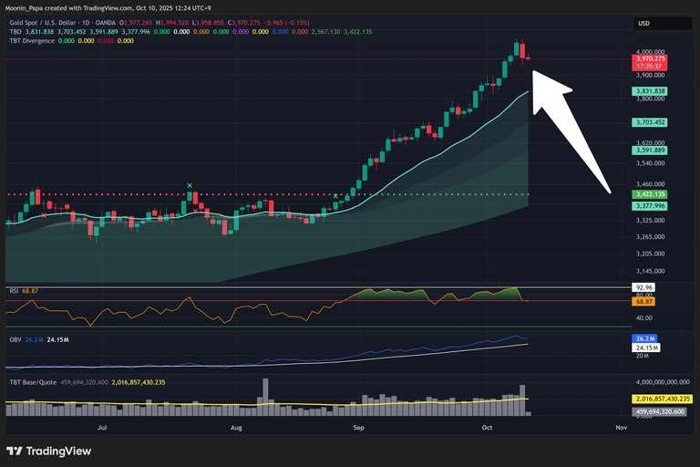 The US Dollar Index closed above its daily TBO Cloud, gaining 0.58%—a notable move for the DXY—while its weekly chart has entered the TBO Cloud for the first time since October 2024. Major equity indices (S&P 500, Dow Jones, Nasdaq) continue to show no immediate technical warning signs, and the VIX remains subdued. Gold, however, posted significant gains amid speculation that a newly announced Israel-Gaza peace treaty may reduce geopolitical risk, potentially marking a short-term top for the metal. Broader concerns over rising unemployment and slowing consumer spending in the US warrant close attention.