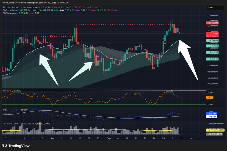 Bitcoin’s recent lower wick on the daily candle suggests a corrective move toward the daily Fast line, echoing similar patterns in August and September where a Springboard Bounce occurred. While the daily RSI is trending lower, both On-Balance Volume and total volume remain robust above their moving averages. The price is still trading above the daily TBO Cloud, which technically maintains a bullish posture despite short-term weakness.
