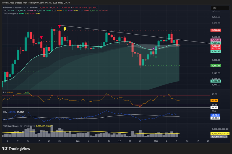 Ethereum’s daily chart shows a retreat into the TBO Cloud after failing to hold above short-term resistance. On the 4-hour timeframe, a third clustered TBO Close Long has appeared, typically a bearish sign in a tight range, suggesting a potential drop toward $3,950 over the weekend. The ETH/BTC pair remains in bearish consolidation, underscoring continued underperformance relative to Bitcoin.