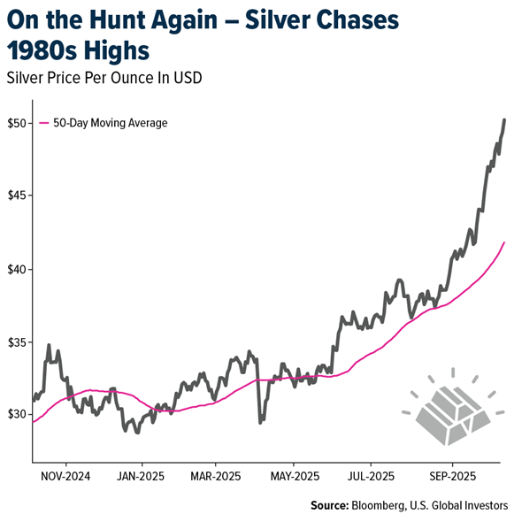 Silver was the worst-performing precious metal of the week, down just 0.48%. Despite the modest dip, silver’s rally remains impressive: prices have surged past $50 for the first time since the Hunt brothers’ infamous 1980 cornering attempt, up 66% year-to-date and outpacing gold’s record-breaking run. A growing physical shortage, reflected in one-month lease rates spiking to 35%, along with booming industrial demand from China’s electric vehicle (EV) and solar sectors, has fueled what some are calling a “New Silver Hunt.” ETF inflows and bullish forecasts suggest the rally could continue.