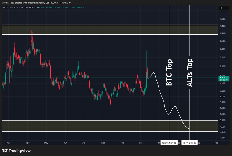 Combined stablecoin dominance is projected to decline toward 5.10%–5.70%, marking a market top phase. A temporary rebound toward 7% is possible, but the prevailing trend supports a drop to 5.10% by mid-December, coinciding with Bitcoin’s advance to $150,000 around November 16. Bitcoin Dominance (BTC.D) has already surpassed 63%, and further gains are expected alongside a new BTC all-time high. Ethereum Dominance (ETH.D) closed above short-term resistance, with a three-day hold likely to confirm a bullish flip and pave the way for ETH to challenge $5,000. Solana Dominance (SOL.D) is on the cusp of a breakout from its bull flag, while OTHERS.D and TOTALE100.D signal potential topping patterns into mid-December.