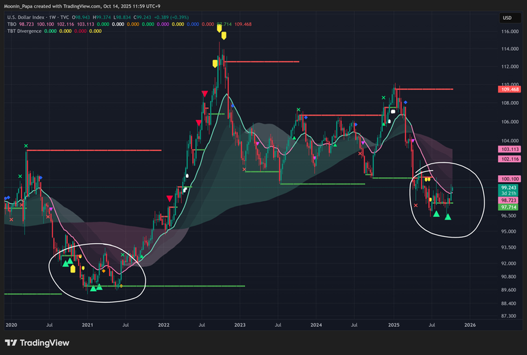 The US Dollar Index (DXY) is mirroring weekly reversal patterns seen in late 2020, suggesting the potential for a parabolic rally toward 123, a scenario that could exert pressure on equities and crypto. The Euro has already printed a weekly TBT bearish divergence, and the Yen continues to weaken. Major US indices (S&P 500, DJI, NDX) have registered weekly bearish divergences, while the VIX retreated on bullish equity closes. Internationally, the Nikkei and Shanghai Composite have rebounded, but the Hang Seng remains under pressure after a second weekly bearish divergence. Gold is advancing amid renewed tariff concerns, and Silver is testing new highs.