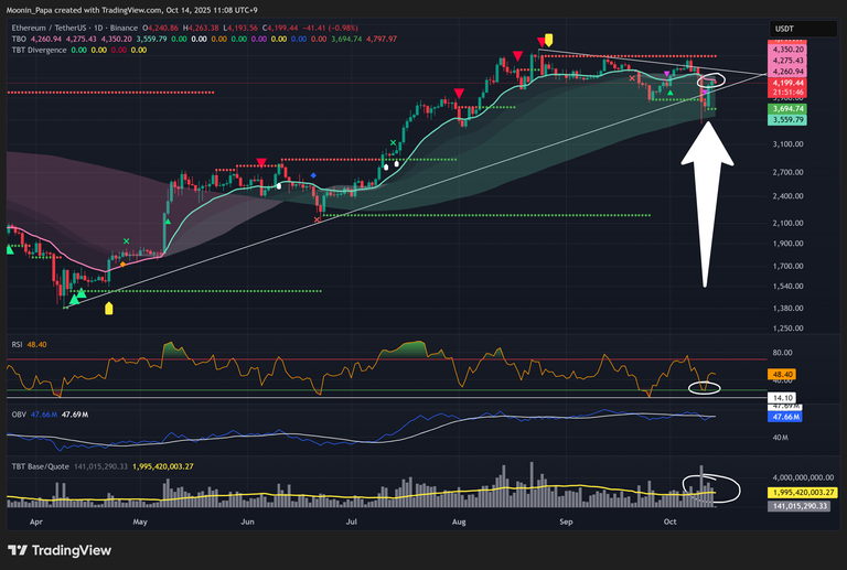 Ethereum (ETH) has demonstrated a modest recovery but remains technically more bearish than Bitcoin. Key positives include the reclamation of long-term support, a smaller RSI reset, and renewed volume strength exceeding its yellow MA. ETH has also tagged its daily TBO Fast line. However, bullish confirmation requires a decisive break above short-term overhead resistance near $4,500. The ETH/BTC pair continues consolidating, with the decisive bullish trigger being a push above 0.038, aligned with the top of the daily TBO Cloud.