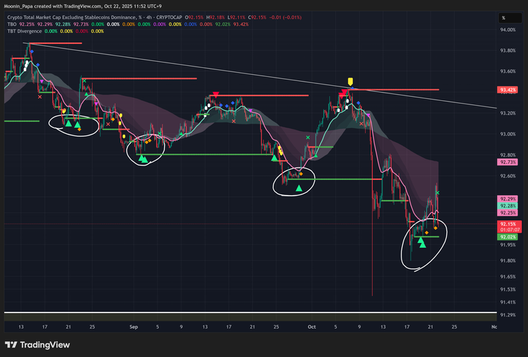 Bitcoin dominance remains below the 60% threshold but is likely to climb if Bitcoin extends its rally toward $130,000. Ethereum dominance sits above resistance but has not yet translated into a sustained ETH/USD advance. Solana dominance is testing overhead resistance within a bull-flag formation. On the aggregate front, total crypto market dominance (TOTALES.D) printed a bullish reversal with TBT divergences and TBO Close Shorts on the 4-hour chart, which was followed by a second TBO Close Short on both Total50 and Total100 indices. These signals suggest a broader market reversal to the upside, pending Bitcoin’s lead.