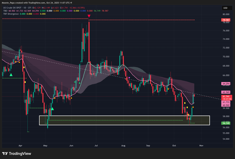 WTI crude oil rose over 8% in two days, printing a daily TBO close short after Western sanctions on major Russian suppliers Rosneft and Lukoil. Gold extended its advance to 0.65%, holding above the daily TBO Cloud despite an RSI decline to 50; a drop into the cloud would herald bearish consolidation. Silver continues to trade sideways following Tuesday’s sell-off.