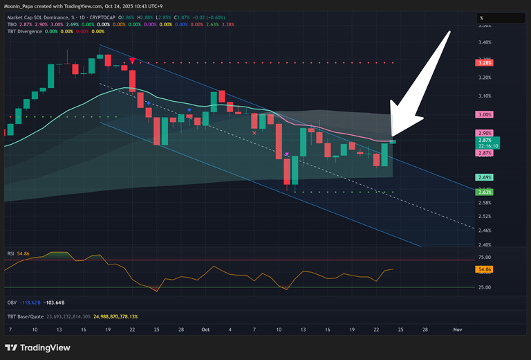 Ethereum’s share (ETH.D) remains weak, while Solana dominance is beginning to trend upward, hinting at an eventual shift in market leadership once BTC.D tops out.