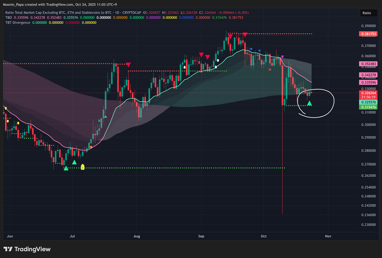 On the daily chart, TOTAL3ESBTC also printed a TBT bullish divergence, suggesting a potential shift toward altcoin outperformance versus Bitcoin over the coming weeks, consistent with an expected end-of-month BTC rally.
