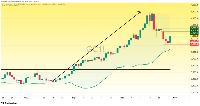 Gold followed silver's lead with an even more pronounced rally, posting nearly $100 in single-day gains. The most actively traded December Comex gold futures contract climbed $98.30, or 2.51%, to settle at $4,039.80 per troy ounce. The advance restored both futures and spot gold above the psychologically significant threshold of $4,000 per ounce, reinforcing bullish sentiment in the precious metals complex.