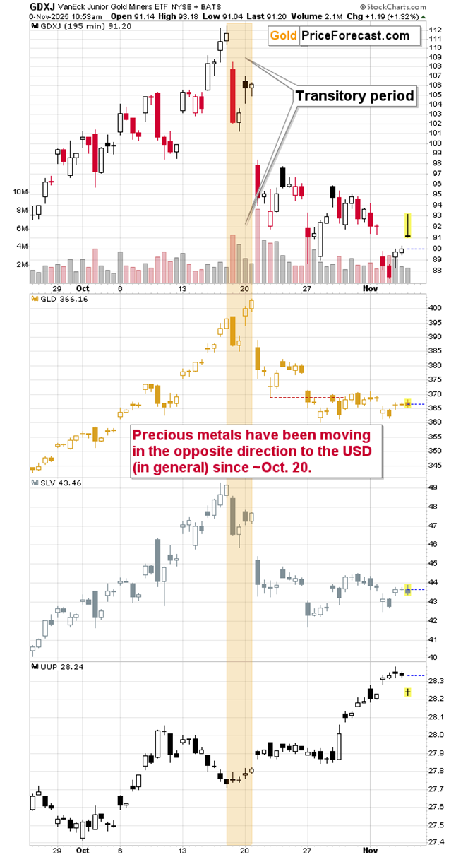 2. The decline in the USD Index (the UUP ETF at the bottom part of the chart serves as a proxy for it) didn’t cause a bigger rally in GLD or SLV.