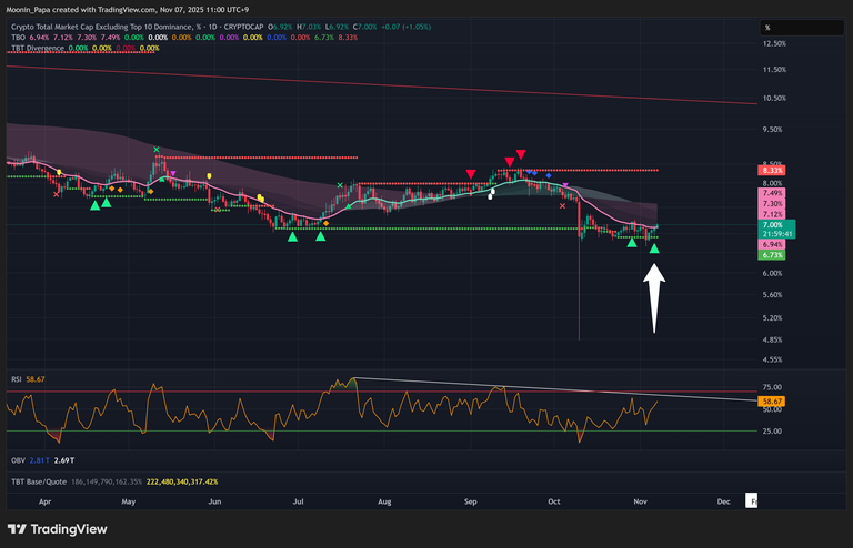 Combined stablecoin dominance continues its uptrend, with the TBO Slow line curving higher and a recent green close as crypto markets fell. This trend signals growing defensive positioning toward a “bear market zone.” Bitcoin dominance (BTC.D) has printed consecutive red closes, but its decline amid rising stablecoin share implies an overall bearish market structure, even as it may spark short-term altcoin rallies.