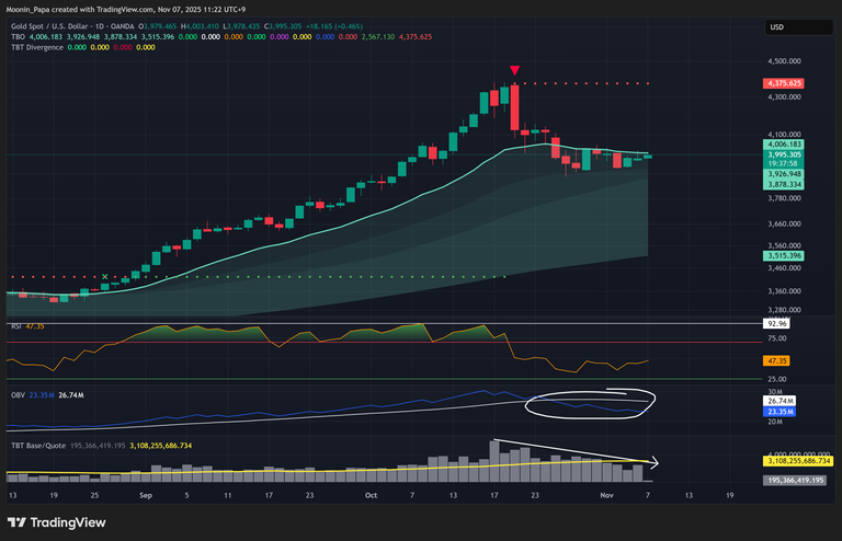 Gold is drifting higher following recent weakness, yet daily volume is subdued and OBV remains bearish. Price is inside the daily TBO Cloud, indicating consolidation until a decisive close above the Cloud. A sustained break and close above $4,100 would confirm renewed bullish momentum, but traders should watch for volume confirmation to validate any upside continuation.