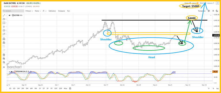 10. In this highly likely scenario, gold pulls back from $4400 to about $4200 and a larger inverse H&S pattern takes shape.