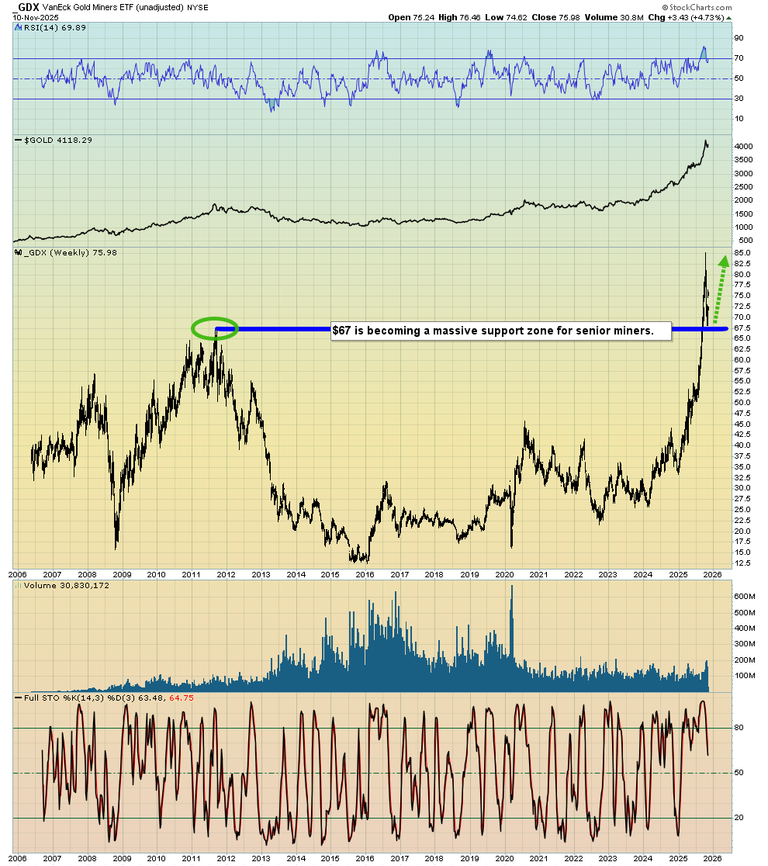 22. The bottom line is that the move to $85 is turning the $67 area into the biggest “floor of sustenance” in the history of gold stocks.A further move up to $100 (my target is $110 for GDX at gold $5000) really locks that in.