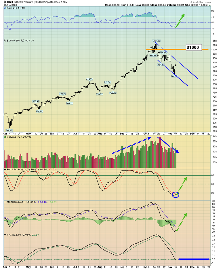17. For a key view of the miners. Click to enlarge this phenomenal short-term chart for the CDNX index. A reaction was expected as it rose to the vital 1000 round number zone.That reaction has occurred and it’s been healthy; volume rose on the surge into 1000, and it has tapered as the price action has softened.