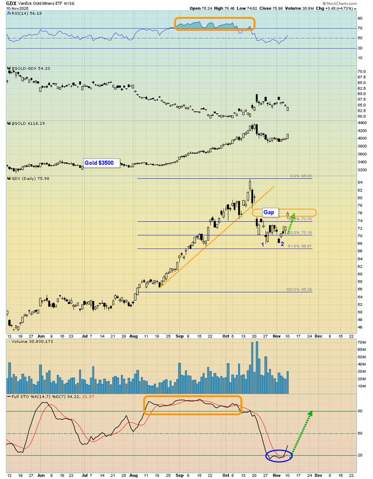 20. Click to enlarge this exciting GDX daily chart. I urged gamblers and aggressive investors to buy a 50% retracement of the gold stocks rally from $3500 gold and on that note…
