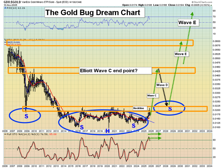 24. It’s unlikely that the big Elliot C wave for GDX on this chart ends until gold trades close to $10,000. Where could GDX trade then? Well, numbers like $200 and $300 are realistic projections. In a nutshell, to fully answer this question, space helmets may be required!