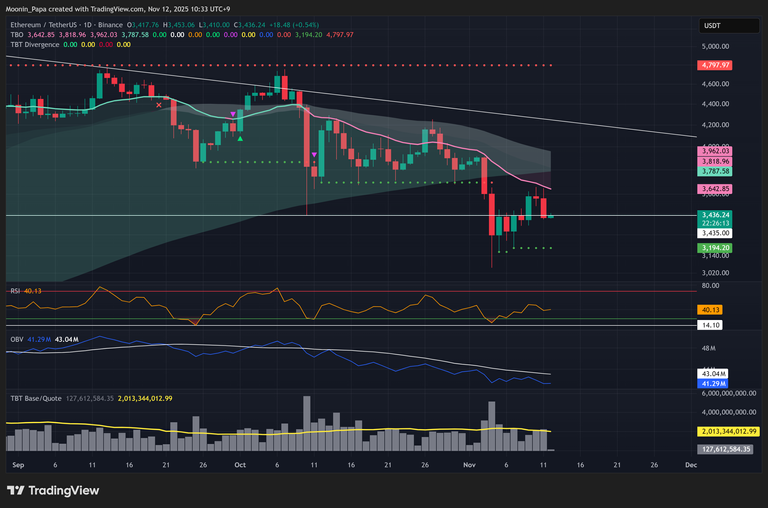 Ethereum experienced a sharp pullback that had the beneficial effect of closing its CME gap near $3,435—the October 10 liquidation low. Price has consolidated around this level for the past week, briefly dipping below before holding support, which sets the stage for a potential bounce. No additional major technical setups are currently evident beyond the gap closure and this key support test.