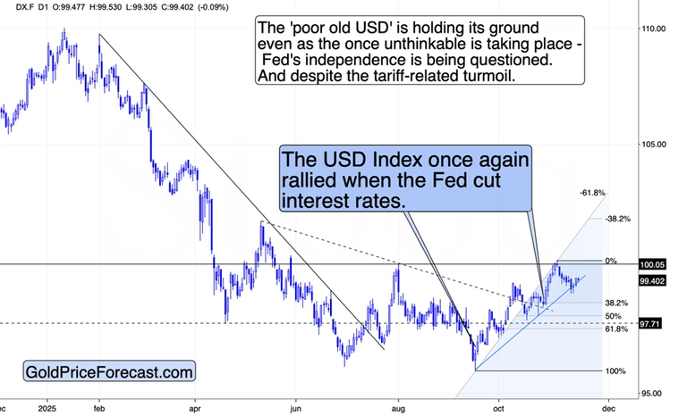 The rising support line held, and the USD Index is now back above its mid-October high. The current situation is not like what we saw in August – this time the USD declined moderately, and it’s already coming back up. It looks ready to finally rally above 100 and hold this breakout.