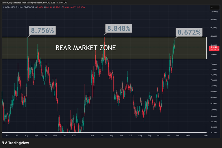 Combined stablecoin dominance reached 8.672%, approaching levels last seen in August 2024 and April 2025. A drop into the daily TBO Cloud would signal a shift to bearish consolidation, providing relief for the broader crypto market. Conversely, a breach above 8.75% would confirm deeper bear market conditions, with daily RSI forming a bearish divergence against higher dominance levels.