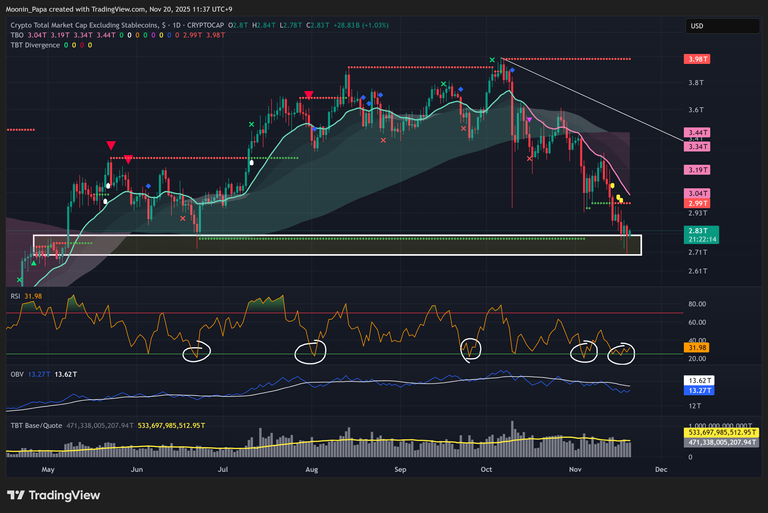 The total crypto market cap excluding stablecoins (TOTALES) remains under bearish pressure but shows “price”-based support and a daily RSI suggesting a rebound is imminent. The OTHERS index sits below its TBO Cloud, yet dominance charts imply rapid reversals are possible if it re-enters the cloud, potentially yielding a TBO Close Short. TOTAL3ESBTC maintains a bullish stance above its compressed daily cloud, targeting TBO resistance for an altcycle peak.