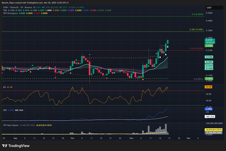 Notably, STRK is on its third daily TBO breakout, driven by record volume and social media attention. A reasonable target lies at the 0.618 Fib level near 0.75, with further gains toward the 1.0 level at 2.67 possible but warranting partial profit-taking under current market conditions.