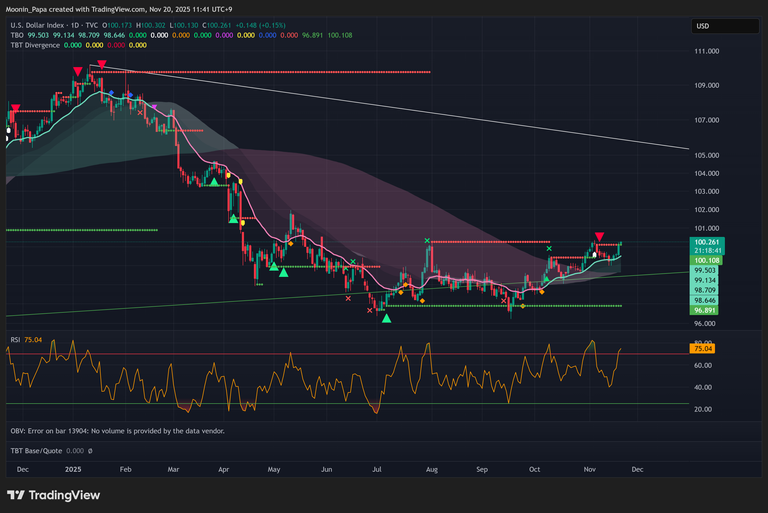 The US Dollar Index (DXY) surged back to historic TBO resistance near 100 following Fed meeting comments, exerting pressure on FX pairs like the Japanese Yen. With the Fed pausing rate cuts in December, S&P futures rebounded while the VIX remains in the “Rejection Zone,” indicating elevated market apprehension. In equities, the Nikkei closed above its daily TBO Fast line after a TBO Close Long, whereas Shanghai and Hang Seng continue to struggle, and Gold oscillates around its daily TBO Fast line.