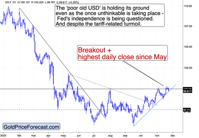 Yes, the USD Index just moved below 100, but it’s now trading very close to its rising support line. The same line that triggered a reversal about two weeks ago.