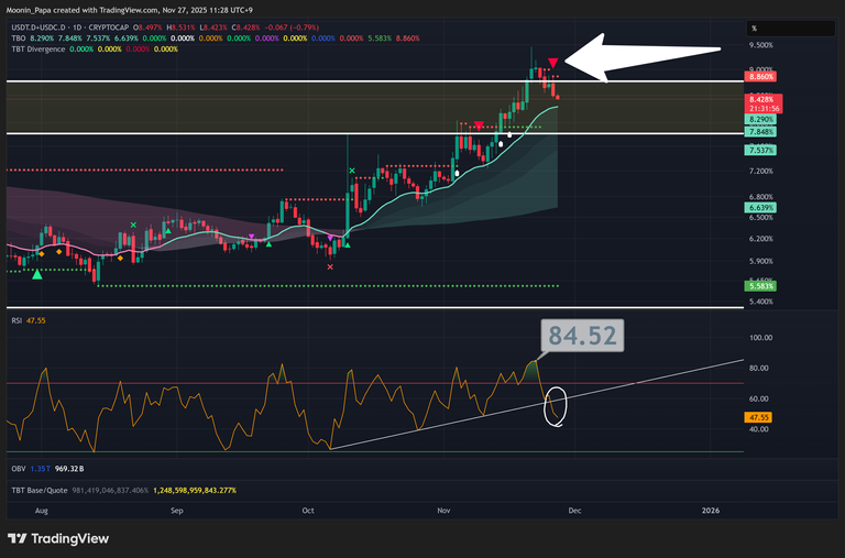 Bitcoin dominance (BTC.D) ticked higher on BTC strength but remains in a macro-bearish regime, with the daily TBO Slow line pointing down and resistance at 57.37%. Combined stablecoin dominance displayed a second TBT bearish divergence and continued RSI weakness. For alts to truly accelerate, we need both BTC.D and stablecoin dominance to decline in tandem and ideally see stablecoin dominance move inside its daily TBO Cloud and close long.