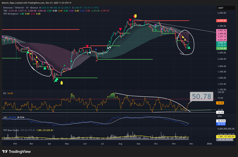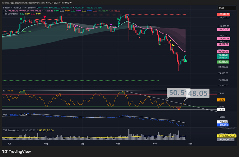 Bitcoin closed up 3.6% yesterday amid rumors of a pro-Bitcoin Fed chair and a TBT bullish divergence forming on the daily candle. The daily RSI is approaching a break above its prior high at 50.51. Our short-term target remains the daily TBO Fast line near $93,000, while the macro trend—defined by the daily TBO Slow line—continues to curl downward, signaling overall bearish bias. Historical parallels in late 2021 and early 2022 suggest similar bounce patterns that led to lower lows, reinforcing the view that rallies may act as bull traps until price convincingly trades above the daily TBO Cloud around $111,000.