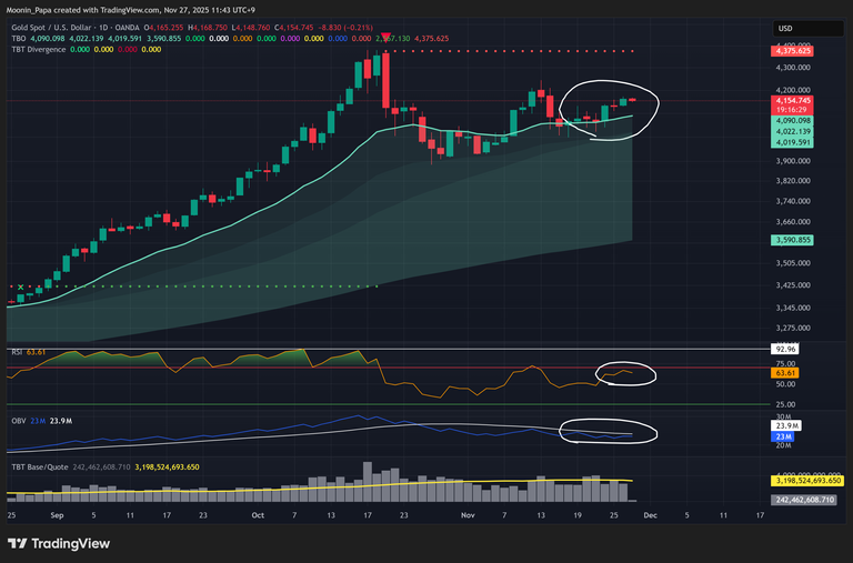 Gold’s slight uptick to $4,173 failed to drive RSI above 70, and OBV remains bearish, indicating waning momentum. Silver may be forming an ascending wedge that could breakout above $54, but volume confirmation is required. The PAXG/BTC pair is printing a TBT bearish divergence on the daily, implying that Bitcoin may outperform gold over the medium term, though historical precedents suggest such shifts can take weeks or months.