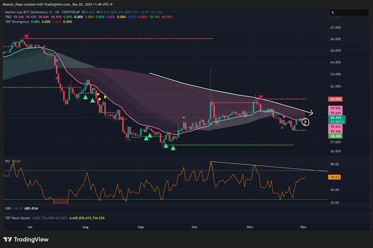 Bitcoin Dominance (BTC.D) is printing a TBO Close Short warning on the daily chart—the first since December 2022—indicating building bullish reversal energy despite a macro bearish slow-line trend. In contrast, OTHERS.D (total altcoins) is oversold on daily RSI, but recent 4-hour TBO Breakdown clusters echo patterns seen on October 5, pointing to further underperformance. TOTAL3ESBTC and OTHERS/BTC display similar breakdowns, suggesting altcoins are likely to lag Bitcoin in the near term.