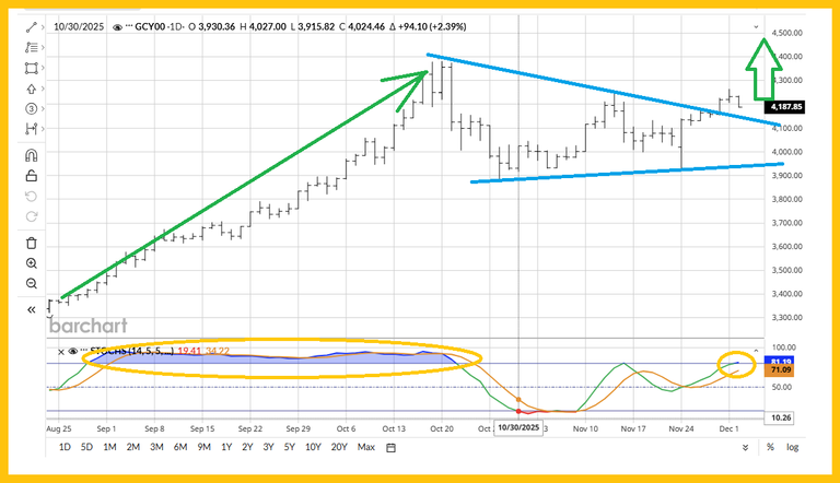 4. Click to enlarge this bullish daily chart for gold. Most bank analysts are projecting gold to move up to $4500-$5000 in the coming months and this bull triangle scenario suggests that will occur.