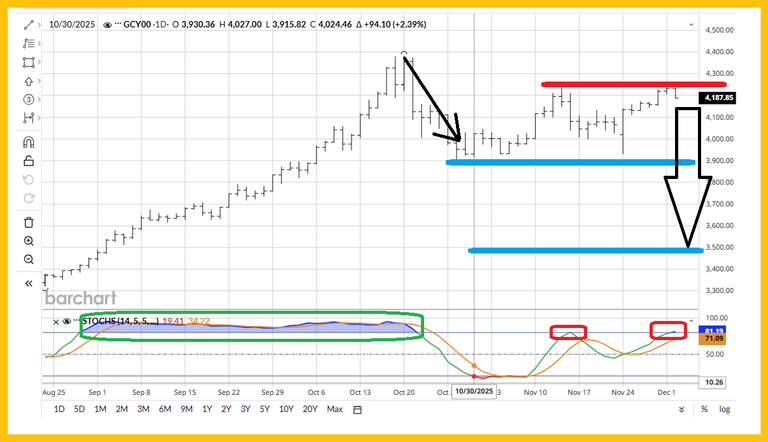 5. Stochastics (14,7,7 series) is overbought, but it was overbought for months as gold surged $1000+ in the previous move up.