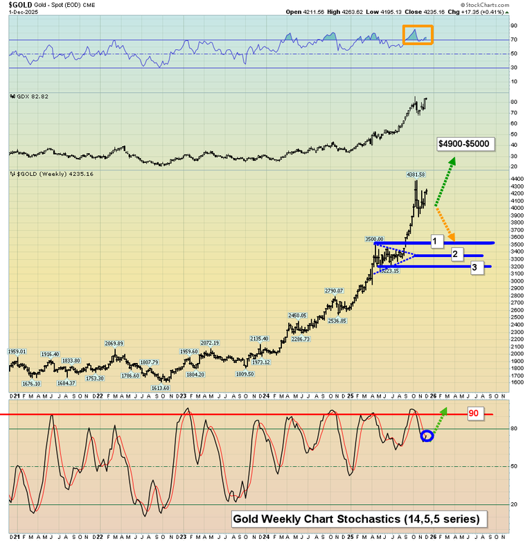8. For a look at that “buy zone of champions”. Click to enlarge this key weekly chart for gold. Stochastics (14,5,5 series) is impressive, but if the buy signal that’s high in the momentum zone fails, a move down to $3900 or lower is likely.