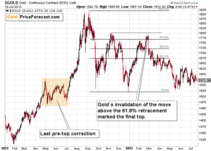 In 2012, the second move above the 61.8% was the final local top before the price moved much lower.
