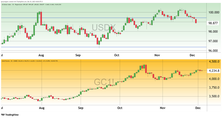 These data points pushed the probability of a **25-basis-point Fed cut** at the December 9-10 FOMC meeting to approximately 89% on the CME FedWatch tool. The dollar index fell to **98.88**, down 7% year-over-year, while the 10-year Treasury yield eased to 4.06% supportive of non-yielding assets like gold and silver.