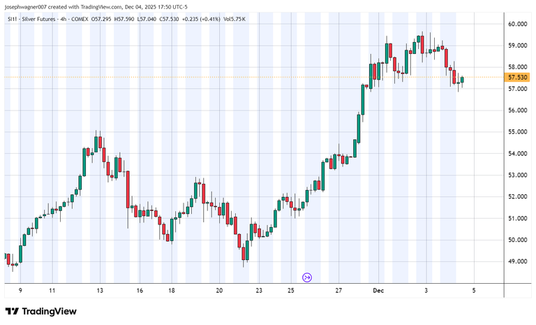 Silver experienced more pronounced weakness, declining $1.40, or 2.38%, to close at $57.53. After establishing multiple record highs earlier in the week, this pullback appears consistent with normal profit-taking behavior that typically follows sharp rallies across all asset classes. Nevertheless, silver's technical positioning suggests it may maintain stronger upward momentum relative to gold in the near term, as market dynamics continue to favor the industrial metal's outlook.