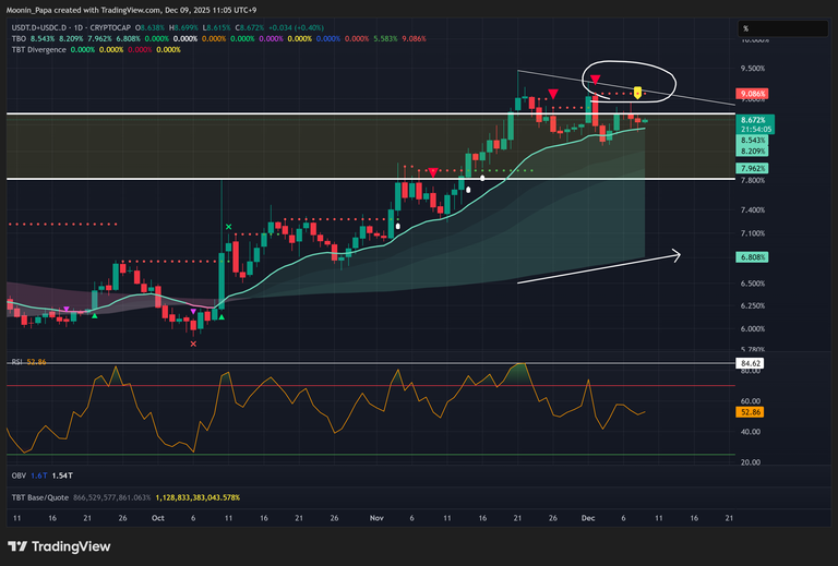 Stablecoin dominance printed a TBT Bearish Divergence Cluster, an early warning of a potential reversal; a shift into TBO bearish consolidation could occur within 1–4 weeks, confirmed by a TBO Close Long. Bitcoin dominance “closed” its second TBO Close Short—bullish in isolation but still macro bearish given its declining TBO Slow line—suggesting further BTC.D weakness would favor altcoins. In contrast, Ethereum dominance is ascending inside the TBO Cloud in bullish consolidation, while total crypto market dominance (TOTALES.D) shows early bullish Divergence Clusters but needs to clear the first resistance fan above 91% to confirm a trend shift.