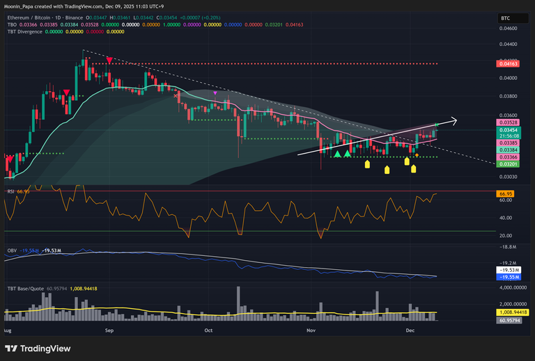 Ethereum continues to consolidate bullishly within the daily TBO Cloud. On-balance volume has crossed above its moving average despite overall low volume, and the TBO Slow line is still rising, indicating a sustained bullish macro trend. The ETH/BTC pair also exhibits strong bullish signals—RSI momentum, TBO indicators and multiple TBT Bullish Divergence Clusters point to a target near 0.04 (about 16% upside). A pickup in volume could accelerate ETH’s outperformance and herald a broader altcoin rally.