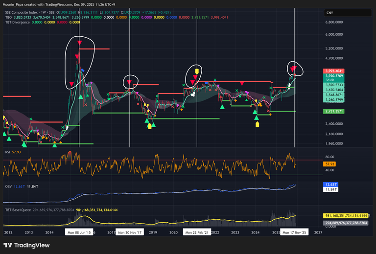The US Dollar Index remains above 97 with potential to retest that level. The S&P 500 failed to breach overhead resistance on Monday and is forming a weekly TBT Bearish Divergence Cluster—if confirmed, another pullback may align with a DXY rally and renewed selling pressure on equities and crypto. The VIX closed at 16.67 without signaling acute risk. In Asia, the Nikkei respects its resistance amid declining volume, while the Shanghai Composite’s weekly Bearish Divergence Clusters mirror historical market peaks (June 2015, November 2017, February 2021, November 2025), suggesting regional markets may be topping alongside the Hang Seng.