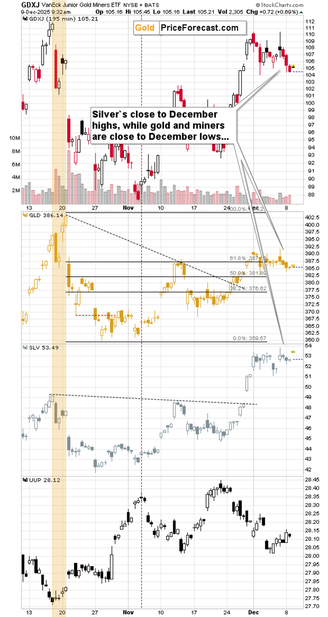 My key observation was that silver is trading at monthly highs, while gold and miners are trading at monthly lows. My comment was that it confirms the thesis that silver is disconnecting from the rest of the precious metals sector.